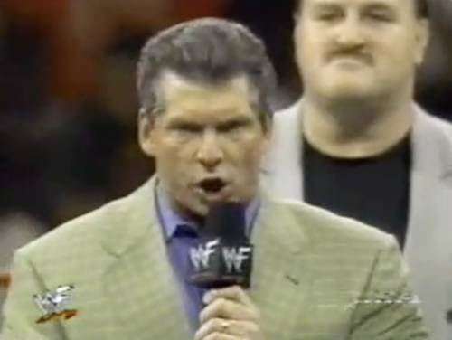 We would be on week two of the new WWF Raw theme song and intro, but they’re skipping it this week. Instead, Vince McMahon enters with his entourage. McMahon denies orchestrating last week’s shovel attack, then announces a new independent WWF commissioner to replace Commissioner Slaughter, who is stepping down. This is good news for many, including me—do you know how annoying it is to have to type “Commissioner” rather that “Sgt.” every time Bob Remus shows up?