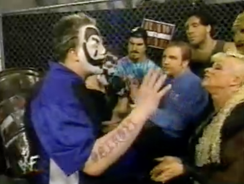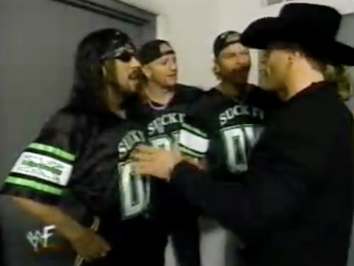 The New Age Outlaws then run to the ring, where they are met with Ken Shamrock and the Bossman. Meanwhile, Vince, Shane, Shawn, and The Rock all chop their respective crotches.