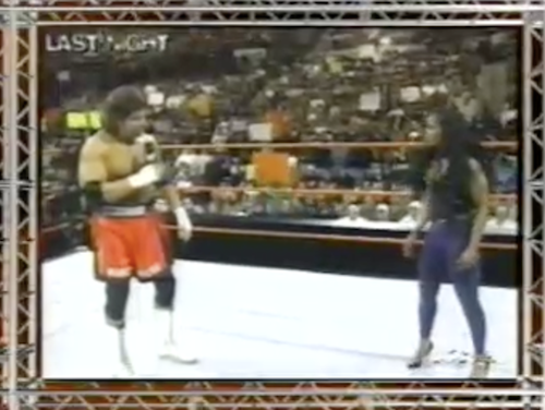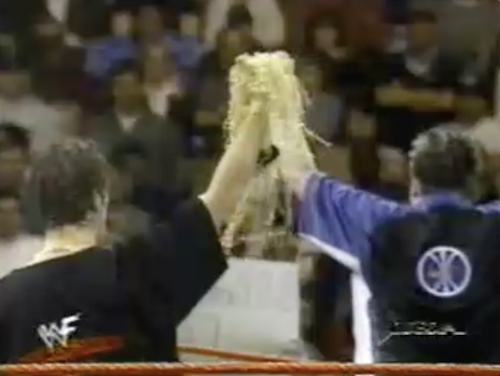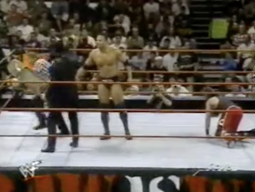 Shamrock now faces the Bossman and Mankind for the Hardcore title. As Mankind’s two challengers are both aligned with Vince McMahon, Jim Ross considers this more of a handicap match. “Triple Threat match my you-know-what!” Ross’s assessment proves correct, as Shamrock and Bossman double-team Mankind.