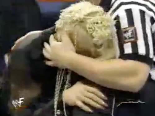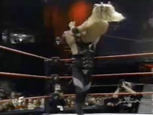 Plus, there’s a wrestling match going on. Goldust sets Mero up in the corner for Shattered Dreams, but Terri distracts the referee, allowing Jackie to hit Goldust in the groin. Now it’s Terri’s turn, kicking Mero in the groin. It’s like Strangers on a Train, except with nut shots. Hell hath no fury like a woman scorned, says Jim Ross, but Jerry Lawler says he’d like Terri and Jackie to “scorn” him. The don’t call him Jerry “The Kink” Lawler for nothing.