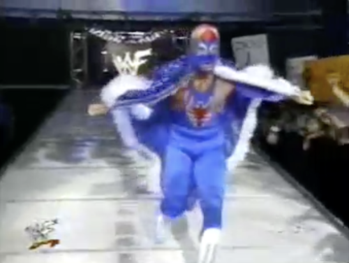Blackman has the Blue Blazer on the run in the early seconds, causing Blazer to leave the ring and say, “Woo!” Undeterred, Blackman chases right after the masked man, chokes him with his cape, and throws him back in the ring. There, the Blazer makes a comeback and locks Steve in a dragon sleeper until he backs the superhero into the corner. Jim Ross notes the Blazer’s “lucha libra” [sic] attire (Spanish for, “fight lb.”), but, upon getting a good look at him, starts to doubt that it’s Owen Hart under the mask. Nevertheless, the Blue Blazer locks Blackman in the Sharpshooter (while covering his own face), which the Lethal Weapon escapes.