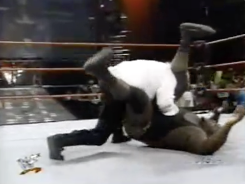 Mark Henry press-slams Gangrel but gets distracted by Chyna for the second week in a row. Henry lights up when Chyna walks on stage, but he gets rolled up and pinned by Gangrel. But even another loss won’t take the smile from his face. His smile turns to pure ecstasy when Chyna agrees to a dinner date, leading Mark to roll around on the mat in celebration.