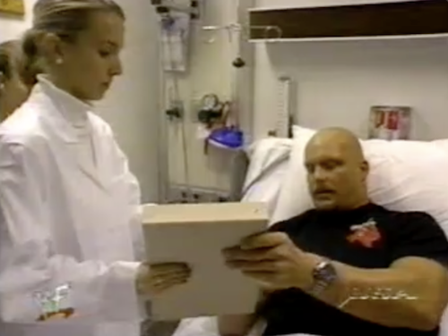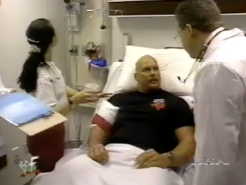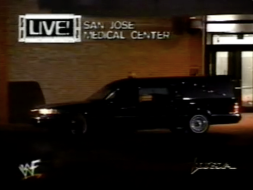 Back outside the San José medical facility, there is indeed a hearse, our biggest clue yet that The Undertaker is coming after Austin. And even bigger clue is the shot of The Undertaker beating up Austin in his hospital bed. “This is where you get off”, says The Undertaker in the non-sexual sense. “This is your last ride.” Jim Ross wants to know what The Undertaker means by that, as he wouldn’t start doing that powerbomb for another year and a half. After the break, the hearse speeds off.