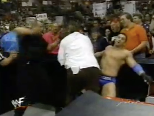 WWF Raw opens with a recap of last week’s episode, wherein boxing referee and judge Mills Lane granted Steve Austin a title shot, Ken Shamrock accepted Vince McMahon as his new dad, and The Undertaker hit Stone Cold with a shovel (which, as a grave digger, should have been his signature weapon all along). Tonight, we will hear from Austin, who is currently in a San José hospital after blacking out at a house show (after his match—he still wrestled as advertised, so don’t let that deter you from buying a ticket to a WWF live event). Why the WWF was in California last night but Ohio tonight is anyone’s guess, unless tonight’s show was taped last Tuesday.