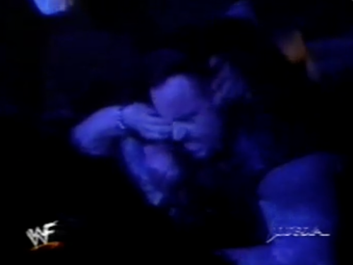 WWF Raw returns as Undertaker lays Austin onto the embalming table. Paul Bearer calls this idea (inviting a camera crew to film them commit murder) the best idea Taker has ever had. Undertaker blames the unconscious Stone Cold for interrupting the “ministry” as Paul Bearer cuts off Austin’s shirt.