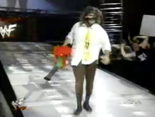 The McMahon men, who booked this match before the appointment of Shawn Michaels as commissioner, watch from the stage. Also watching is the bald, goateed fan in pink, an Ohio staple seen at SummerSlam 1996, among other events. The Bossman uses his nightstick throughout the match but runs into trouble when he tries to use a chair; Shamrock restrains Mankind for this chair shot, but Foley slips away, leading Ken to take the chair to the head.