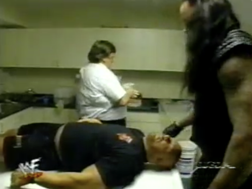 In a cemetery, The Undertaker digs a hole to bury Steve Austin alive. Without a referee? That’s heinous. When Stone Cold fights back, Paul Bearer ethers him. Undertaker then decides that, rather than burying him alive, he will embalm Stone Cold alive.