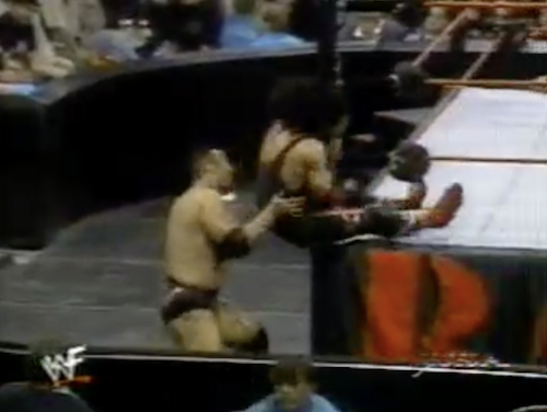 Despite continued woooos by the Blue Blazer, Jim Ross expresses more doubts about the Blazer’s identity tonight. For example, his nose is average size. Blackman levels the masked man with a bicycle kick, covers him for the 1-2-3, and decides to solve the mystery himself. Luckily, the Blue Blazer’s good friend Owen Hart makes the save, chop-blocking Blackman behind the knee. Hart then runs off, covering his ears to drown out the chants of “Nugget”.