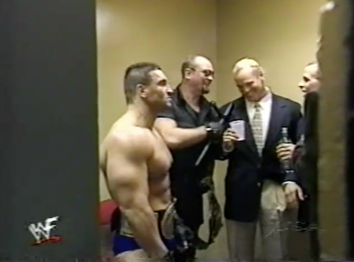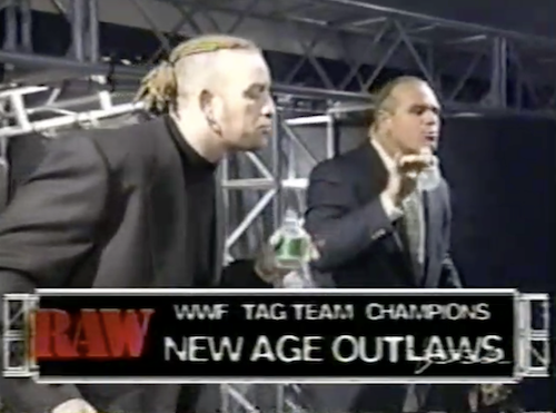 Triple H calls out the New Age Outlaws for allegedly not having sufficient testicles to tell him they were going corporate. The Outlaws promptly appear in suits sipping tiny water bottles. Then again, both men are surprisingly tall, so maybe the waters are normal-sized. “The Road Dogg and Billy drinking bottled water!?” notes an incredulous Michael Cole. Next thing you know, Triple H will start drinking bottled water!