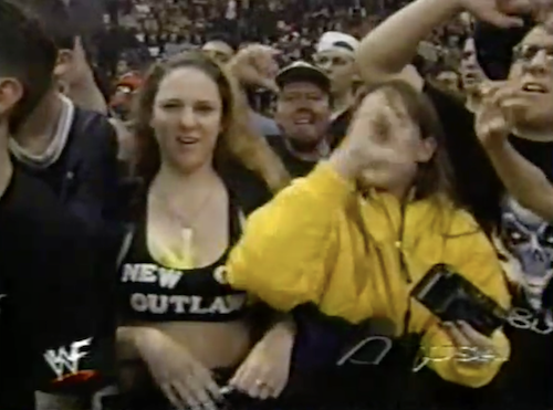 Road Dogg introduces the team as the New Corporate Outlaws, consisting of Road Dogg, Esquire and Billy Gunn, Inc. While none of these new names makes any sense, the message is clear. Their fans are clearly disappointed, with one woman ripping the “A” off her custom New Age Outlaws tube top.