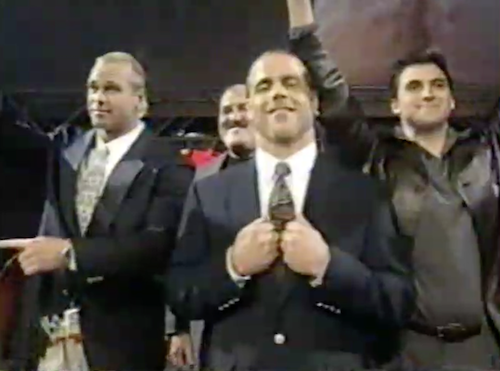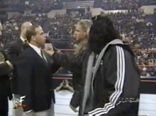 The New Corporate Outlaws introduce Commissioner Michaels, who claims to be the sole founder of D-X who turned Triple H into a somebody. In response, Hunter says he carried HBK when he had no business being champion (i.e. because he was injured and high). Michaels retaliates by putting HHH and X-Pac in an anything-goes match with Ken Shamrock and the Bossman; X-Pac makes the “jerk-off” motion in Shawn’s face during the announcement.