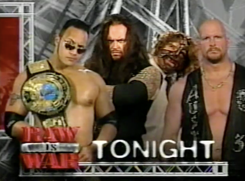 Tonight, Austin and Mankind face The Undertaker and The Rock. Cue the WWF Raw intro.