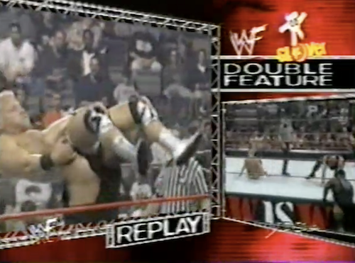 Shawn Michaels saunters to the ring with the Outlaws, who Jerry Lawler thinks will defend their titles against X-Pac and Triple H on Sunday. The New Corporate Outlaws cheer on Shamrock and Bossman. Shamrock locks X-Pac in a front facelock. “Look at this maneuver”, says Cole, which is still better commentary than the Bob Saget-like voice Lawler does to imitate Mankind.