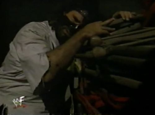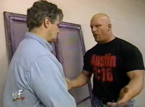 Before WWF Raw goes to break, Mankind wanders into Stone Cold’s dressing room.