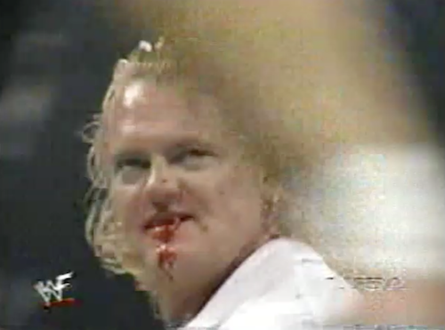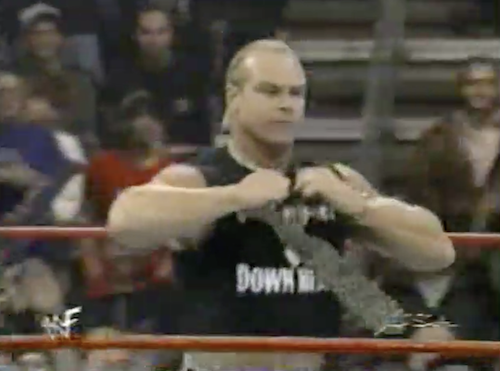 D’Lo hits a precarious running powerbomb on Jeff, garnering a big pop, a replay, and a declaration of “What a maneuver!” by Michael Cole. Goldust then comes to ringside in a trench coat and exposes himself to Debra. D’Lo takes advantage of the distraction to roll up Jarrett, over whom he already had the upper hand anyway, for the 1-2-3. Goldust then opens his coat once more on his way back up the ramp, but cameras cut away.