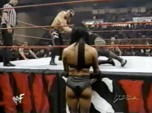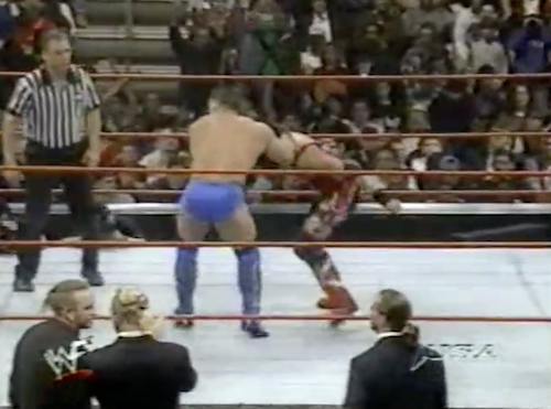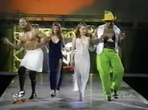 Jerry and Michael finally take note when Debra walks down in a trench coat of her own and flashes Goldust. However, it’s Owen Hart who is most distracted; Goldust rolls him up for the victory.