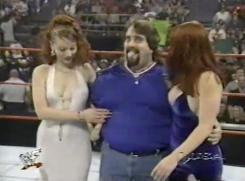 Val Venis and Godfather come to the ring with two ladies. Godfather and Val have formed what Michael Cole calls a union, but he’d better not let Val hear that word! After a noticeable edit, Godfather says that “this town” has some great hos. Clearly, the WWF doesn’t want to say where exactly they are (New Haven, for the record). Godfather then offers a free ho to any member of the audience, an offer taken up by a short and squat pervert. In fact, “Bob” gets both women for the night.