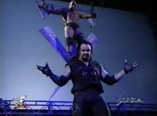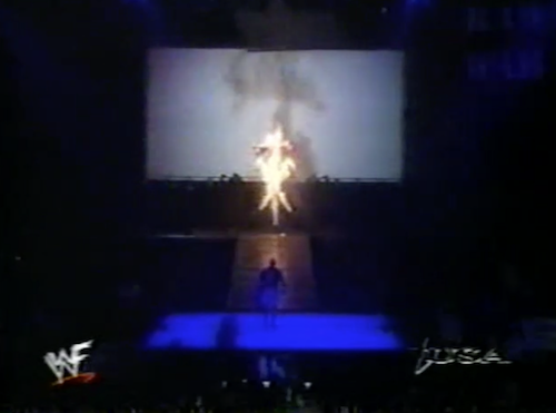 Steve Austin kicks off WWF Raw’s second hour, surprisingly referencing the attempted embalming that the replays have ignored all night. He is interrupted by The Undertaker’s music; the lights go out, the Undertaker’s voice comes on, and a big… uh, symbol appears in front of the Titantron. Taker says he will sacrifice Stone Cold to the Ministry of Darkness at Buried Alive. Lightning then sets the crucifix-like symbol on fire. I know we’re not there yet in the storyline, but my bet is that Dick Murdoch is the Higher Power.
