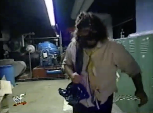 Before WWF Raw goes to commercial, Mankind is seen leaving Stone Cold’s locker room smiling. But is he really smiling, or just trying to fit his tongue through the hole under his lip?