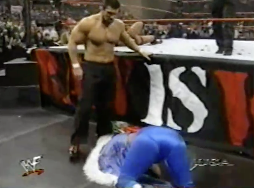 Gangrel starts the match with his drink dripping down his chin. Jerry Lawler asks Cole what “that stuff” is, and Cole replies, insightfully, that “it’s some kind of red substance”. Edge and Gangrel hit a double-DDT off the second rope, prompting Cole to once again say, “What a maneuver!” A little while later, the Headbangers hit Edge with a double flapjack; Edge kicks out of the subsequent pin before Luna pulls Mosh out of the ring. This leads to a whole parade of freaks, starting with Babu and Tiger Ali Singh who scrap with Luna, followed by the Oddities who back up Luna and dance to their ICP music.