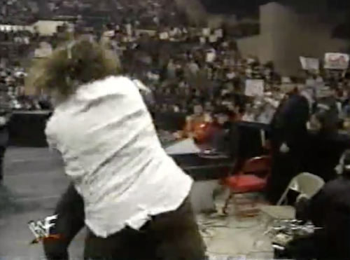 Austin and Taker battle through the crowd before Stone Cold nearly chokes out the Undertaker with a cable. Taker escapes by hitting Austin with the ring bell, then a chair (to which Jim Ross, whose voice is picked up by the camera’s microphones, says “good God!”), and carries Austin up the ramp. Steve’s trunks are filthy thanks to the brawling on the arena floor.