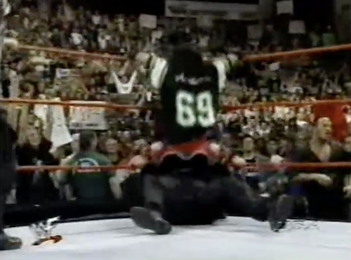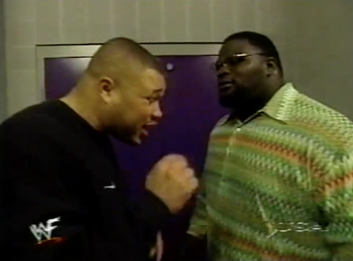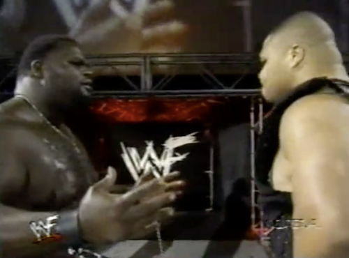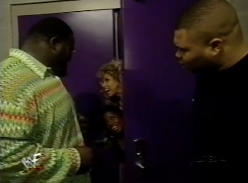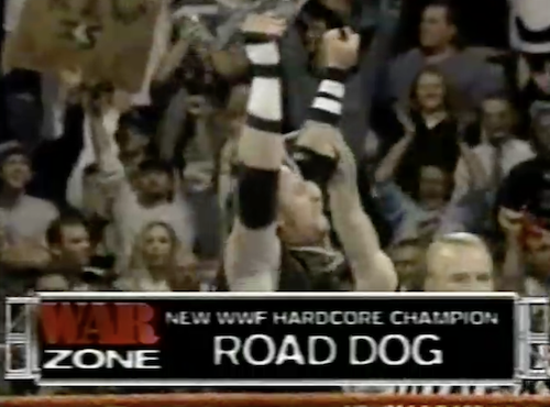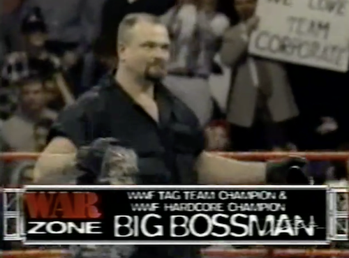 The Bossman, who won zero titles in his original five-year run with the company, comes to the ring with his two title belts. Road Dogg accuses Bossman of using his nightstick as a sex toy with Dogg’s cousin in prison, then dares him to put the Hardcore title on the line. Bossman agrees and threatens him with “hardcore” and “hard times”. He’s not beating the allegations.
