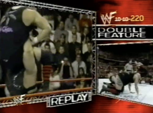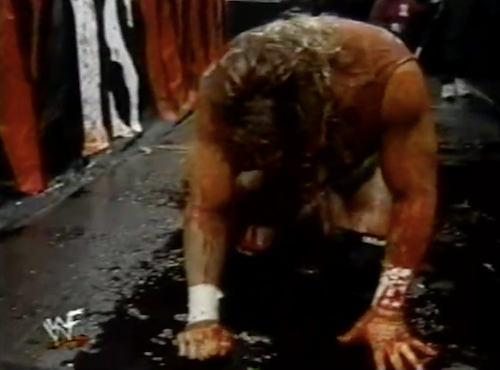 When WWF Raw returns, footage airs of the JOB Squad coming to Al Snow’s aid. Snow is beside himself at being covered in blood. Yes, blood. It’s okay to call it blood if nobody’s drinking it. “Not again!” says Al Snow, confusing the announcers, who’ve only seen him get this one bloodbath.