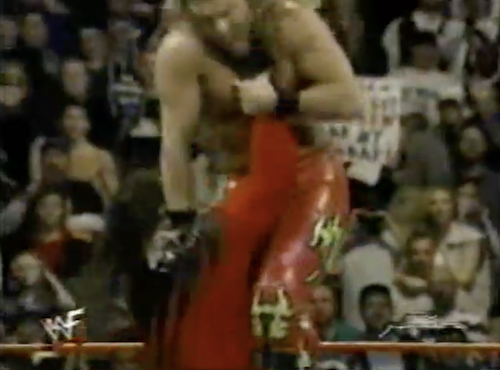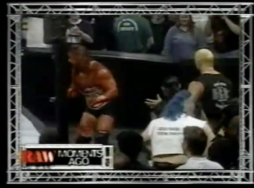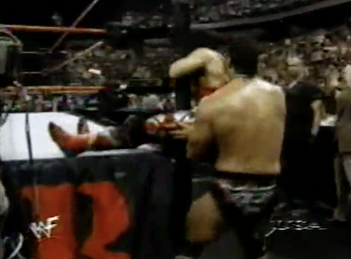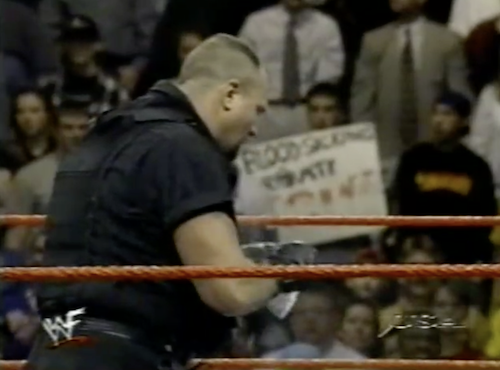 After whipping Road Dogg with a belt, Bossman takes out a bag of white powder. Surely it’s talcum powder, because as Jerry Lawler earlier noted, there are no drugs in the WWF. “It’s some of that stuff he must have confiscated down there in Georgia”, jokes Lawler. Naturally, the powder ends up in Bossman’s face.