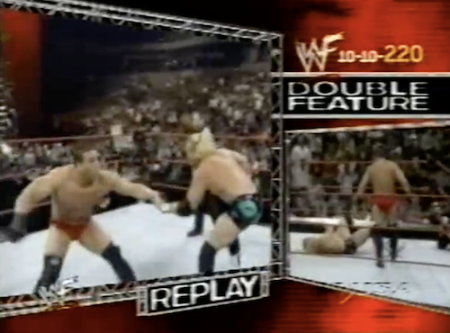 Test and Triple H punch it out in the corner. Thanks to a distraction from The Rock, Test boots Triple H in the face and stomps him so many times, they have to cut some of them out in post. Triple H tags out after dodging Test’s charge to the corner.