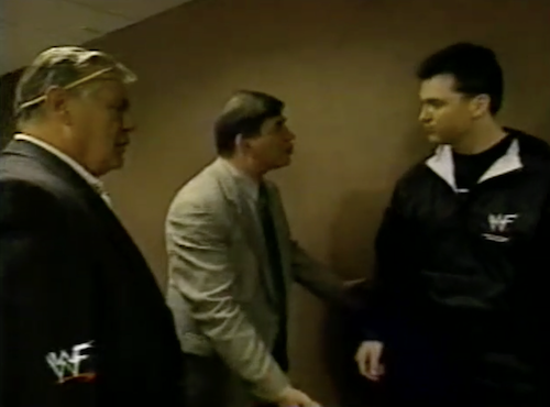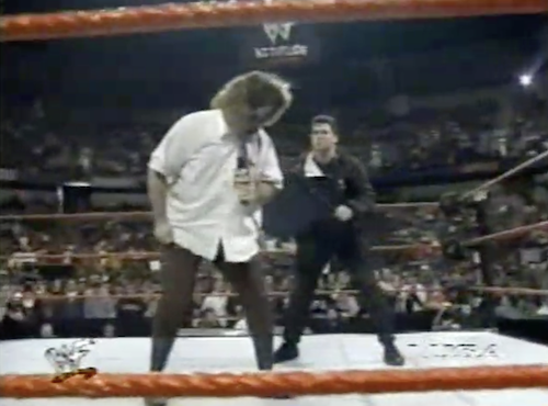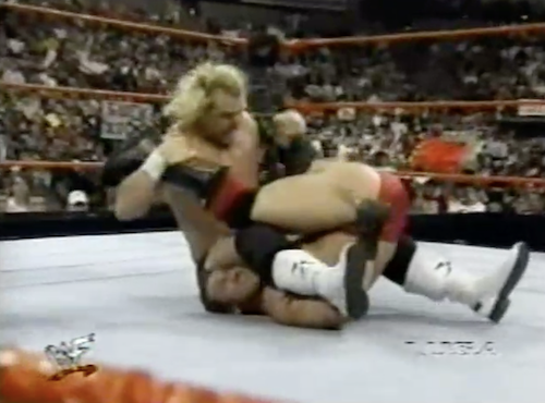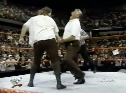 Despite Tony Chimel’s declaration of a new Intercontinental champion, Shawn Michaels begs to differ. His exact words were that Billy would “fight” the Intercontinental champion, not that the title was up for grabs. Don’t try reading between the lines when all the words are slurred! Mr. Ass therefore has to return the belt, but he drops his trunks, as well. The Commissioner does the “Ew, stinky” nose wave before Shamrock blindsides Gunn.