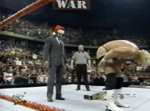 In the midst of all this action, Cole and Lawler run down tonight’s card, with Cole adding that he’s excited for the real Santa Claus. Gunn scores another near-fall, but when Shamrock cuts his leg out from under him, it looks like it’s over for Billy. Shamrock then attempts a victory roll, but Gunn counters with a roll-up for the 1-2-3. Billy Gunn is the champion, I assume!