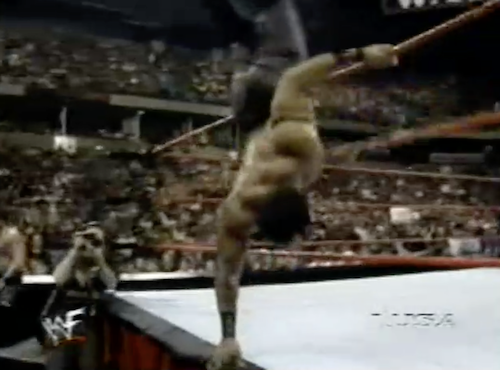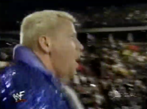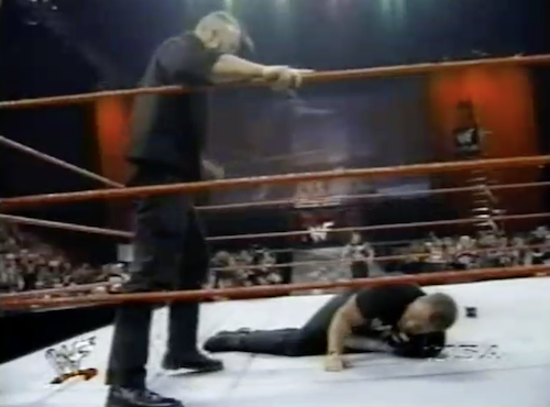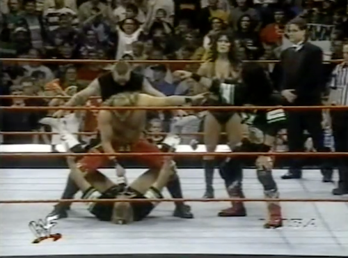 Mankind starts punching out a fleeing Shane, followed by the stooges, who bump around foolishly in an attempt to bail Shane out. Mankind ends up grabbing Patterson’s testes, which Michael Cole calls “Mr. Jacko”. As in Michael Jackson?
