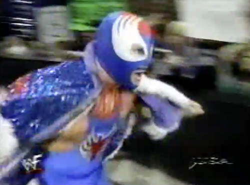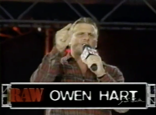 “Double B” Blue Blazer jumps Blackman from behind while Owen heads to the announce table. Last week’s WWF Raw was clearly edited to frame him, argues Owen, but Michael Cole points out that the show was live last week. “It’s not me”, says Owen. “I don’t care”. Owen storms off, then trips Blackman and stomps him. The Blue Blazer, who has not removed his cape, loses via DQ.
