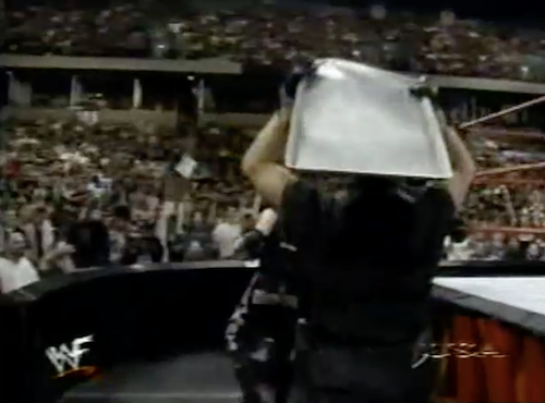 Once Bossman escapes the can, he nooses up Road Dogg again and whips him back and forth between bleachers. He does this so many times, a section is cut out in post-production, jumping to where Mankind sneaks up from behind. Mankind puts a net over Bossman, then hits him in the face with a bar. Road Dogg, noose still around his neck, pins the Bossman to win the Hardcore title.