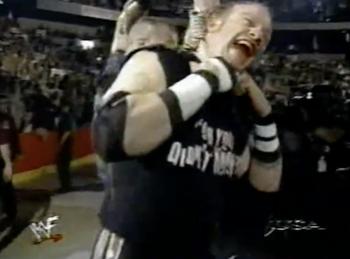 Mankind then applies the Mandible Claw to Shane using Mr. Socko, at which point The Rock finally intervenes, drawing a DQ. D-X then runs down, with X-Pac targeting Shane. “I can’t believe he’s Bronco Busted on Mr. McMahon’s son,” says King, which sounds absolutely filthy. Mankind and D-X drive the Corporation away.