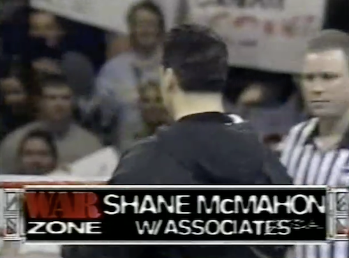 Shane McMahon has one last surprise: he will go up against Mankind tonight as payback for Foley’s beatdown of Vince last week. “Is Shane out of his mind?” wonders Michael Cole lifelessly and insincerely (For simplicity’s sake, just assume everything Michael Cole says from now until Jim Ross’s return sounds lifeless and insincere). Shane says he’ll kick Mankind’s ass, to which Mankind laughs for thirty seconds straight.
