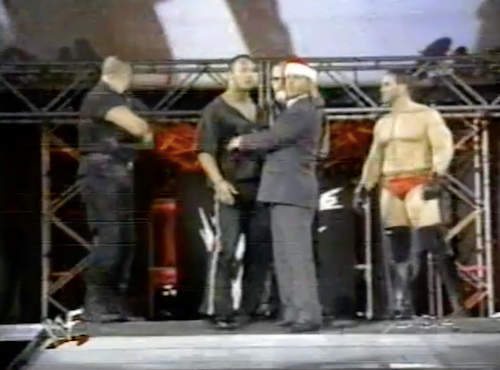 The lights then go out, and Kane’s music hits. Now free from the asylum, Kane saunters to the ring but to everyone’s surprise, he chokeslams D-X one by one. He even goozles The Rock until the Corporation waves it off. It seems the Christmas bonus is a Christmas Creature! The show ends just before Kane chokeslams Chyna.