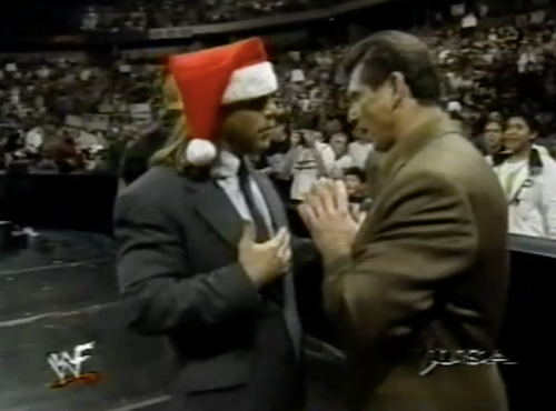 Shane dances around the ring and tries some jabs before Mankind brings him back to reality with a clothesline. Up on the stage, Shawn Michaels holds back the Corporation from interfering just yet. Mankind grabs a chair and tells Shane he has a “Christmas surprise”; when Shane turns around, Mankind fakes him out like he’s going to swing it, sending Shane cowering to the mat. Instead, Mankind hands Shane the chair and tells him to hit him with it. His back turned, Mankind takes a chair to the back of the head and shoulders but is unfazed.