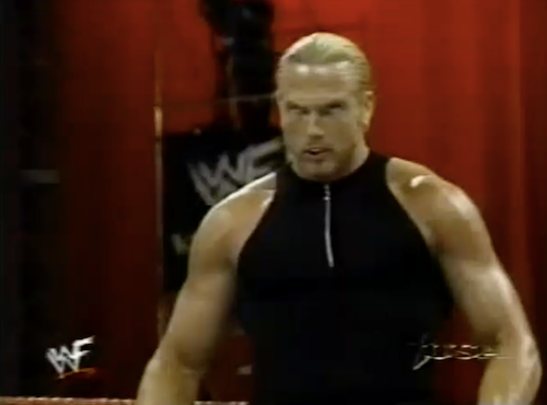 Triple H and Test square off next. Last night on Heat, Hunter skewered Test’s physique (specifically his lats) but ignored the fact that the Corporation’s newest member is wearing a woman’s top. Michael Cole cites Test’s hockey, football, lacrosse, and rugby experience.