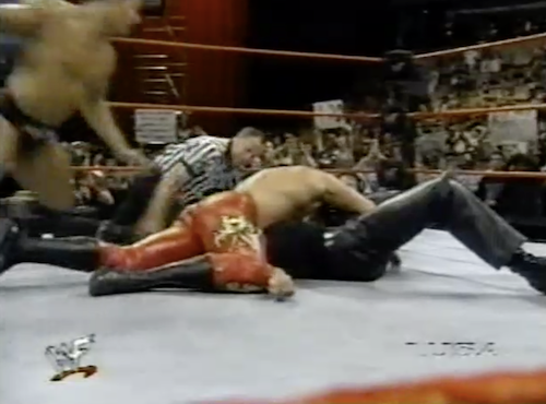 While Jerry and Michael debate the merits of pregnant women and their sexiness (both men ultimately agree), Bob Holly and Scorpio enter the ring to face the Acolytes (whose original manager, the Jackyl, has now been forgotten). Bradshaw roughs both opponents up real good, and when Scorpio runs at Faarooq (standing on the apron) with an elbow, Scorpio somehow ends up selling it like he’s the one who got elbowed. The Acolytes deliver a high double-spinebuster to Scorpio, allowing Faarooq to attempt a one-footed pin that Holly breaks up.