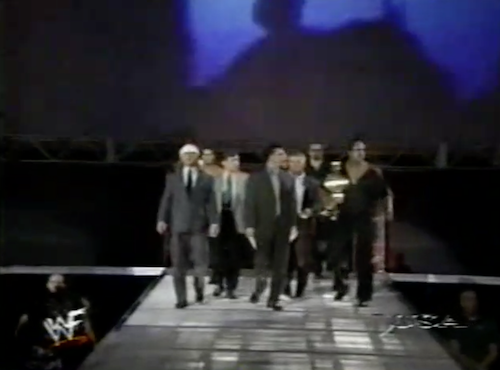 An inebriated-sounding Shawn Michaels slowly and raspily books Billy Gunn vs. Ken Shamrock, then books Road Dogg in a “big fat rolled-up hydroponic whompin’ and a stompin’” against the Bossman. Plus, Triple H and “his male companion X-Pac” face The Rock and Test.
