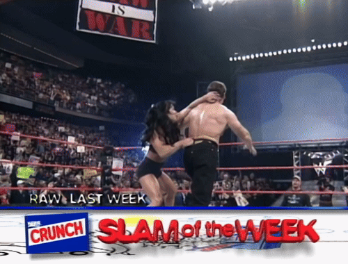 The Nestlé Crunch Slam of the Week is Chyna’s victory last week in the Corporate Rumble, offering two new angles of Vince snapping his neck against the bottom rope.