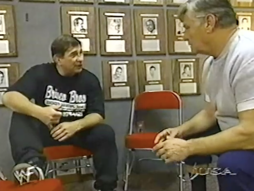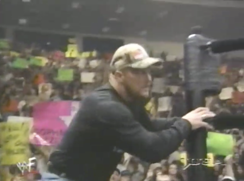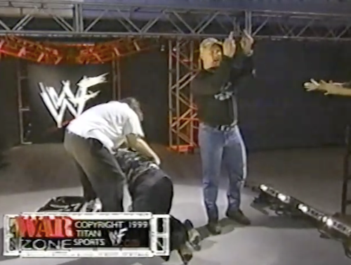 In more training footage, Vince McMahon spars with Tom Prichard, whom he pretends is Steve Austin. Hey, that’s no more unrealistic than pretending he’s Chris Candido’s twin! The boss also practices throwing out some of Tom’s masked trainees. McMahon tells Austin (presumably the real Austin, not Tom Prichard) that there is no chance in hell that Stone Cold will win the Royal Rumble.