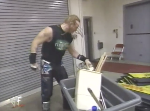 Backstage, Road Dogg loads up a cart with junk for his Hardcore title defense against Gangrel.