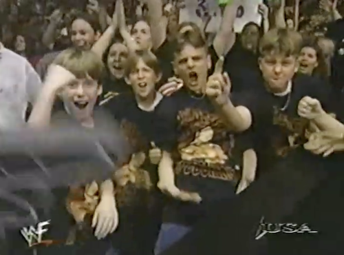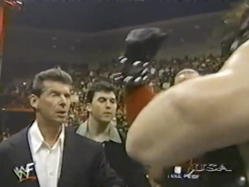 It’s main event time, and Vince McMahon demands that Kane lay down for The Rock, Fingerpoke of Doom-style. Instead, Kane gives McMahon a bras d’honneur, so the rest of the Corporation puts the boots to the big man.