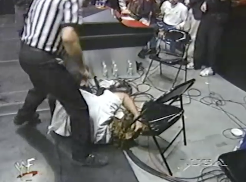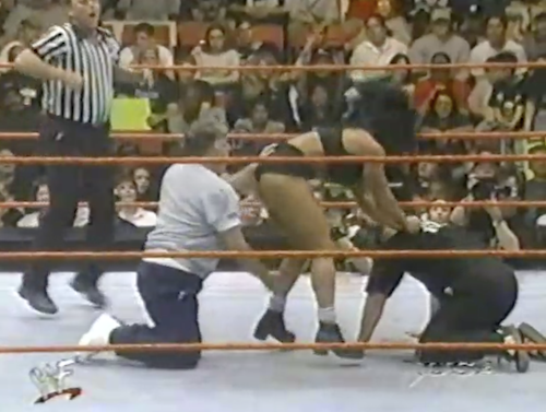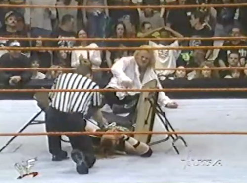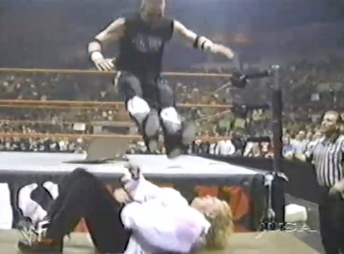 The Rock isn’t finished with Foley, delivering the Rock Bottom onto a chair. Jerry Lawler guesses that’s Mankind’s ninth concussion tonight, while Michael Cole calls Foley “the most durable superstar in the history of the World Wrestling Federation”, ten months before he’d announce his retirement at age 34.