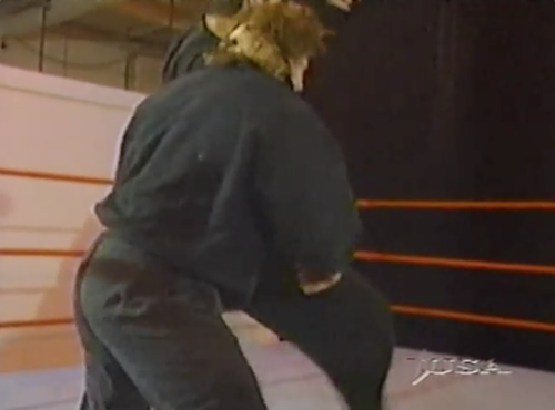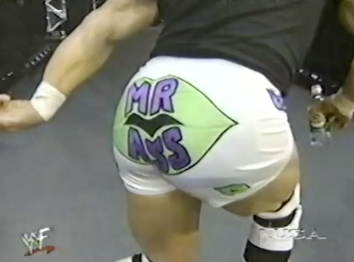 Out comes Mr. Ass, whose persona Jerry Lawler sums up succinctly: “You know, nobody knows more about ass than this man. He’s an ass man!” Last week, Mr. Ass did what Cole calls, “the unthinkable”, mooning Ken Shamrock’s sister, and I can honestly say that before last week, such a thought would not have occurred to the average WWF Raw viewer.