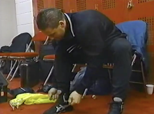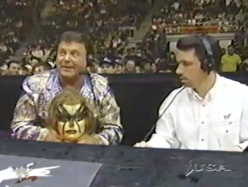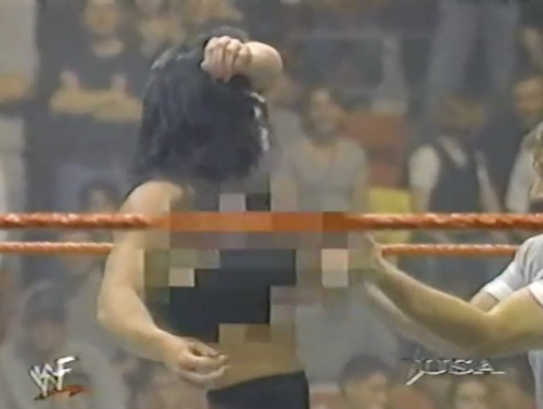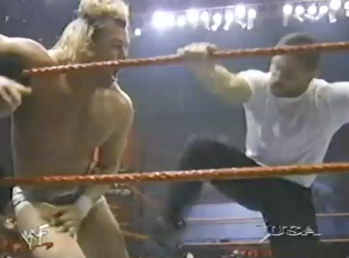 WWF Raw cameras catch Ken Shamrock lacing up his shoes in his dressing room. The announcers note that Ken isn’t scheduled to compete tonight. And yet he’s wearing shoes? Suspicious.