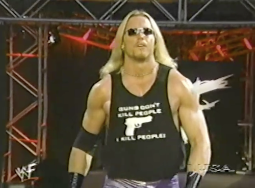 Gunn’s opponent is Test, who wears a shirt reading, “Guns don’t kill people. I kill people!” Gun is spelled with one n, however. The two blonds engage in a lengthy collar-and-elbow tie up, break it up long enough for Billy to tell Test to suck it, then go right back to the lock-up. Test hits a cheap shot on Billy Gunn, prompting the fans to agree with Gunn’s suggestion.