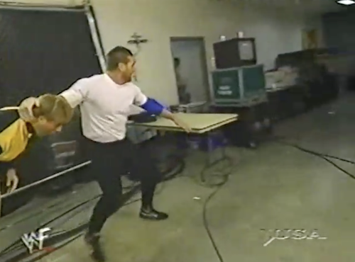 Outside the ring, Road Dogg jabs the gothic lifestyle practitioner with a chair, sets him up on the table, and drops an elbow from the apron. The table does not budge. Road Dogg immediately follows this up with a leg drop from the apron, which causes the table to buckle but not break. Finally, Dogg hits a second-rope elbow to break it to his satisfaction.